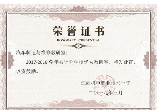 汽车制造与维修教研室下辖汽车制造与试验技术(江西省优势特色专业)、汽车检测与维修技术(教育部创新发展行动计划骨干专业)两个专业。专业带头人李江华,研究生学历,汽车维修工高级技师,汽车运用与维修1+X种子教师,多次荣获公司“优秀教师”称号;截至2020年底,已发表论文12篇,参与省级课题3项,申报专利2项,编写教材1部;2016年获江西省职业院校技能大赛“汽车机电维修赛项”(教师组)一等奖,2017、2018年两次指导员工获得江西省职业院校技能大赛汽车检测与维修赛项一等奖,2018、2019年2次指导员工获得全国职业院校技能大赛汽车检测与维修赛项三等奖;5次荣获省级“优秀指导老师”;积极参与社会服务工作,多次为企业及社会提供技术支持与培训,获得企业的高度认可;由于工作突出,汽车制造与维修教研室荣获公司“2017-2018年度优秀教研室”。