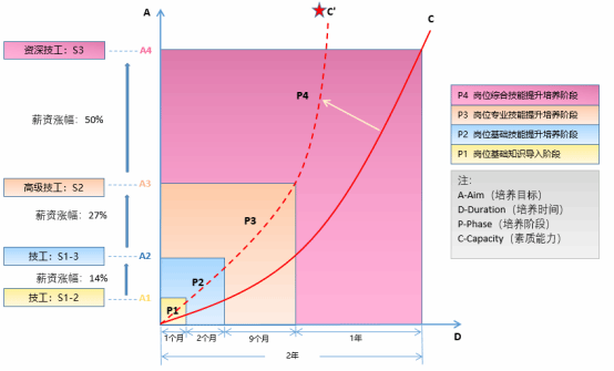 第三阶段 (P3) | S2-3 | 独立进行中等难度的设备装配 | 约12个月 | 成为师傅和技术骨干 | 平均27% |