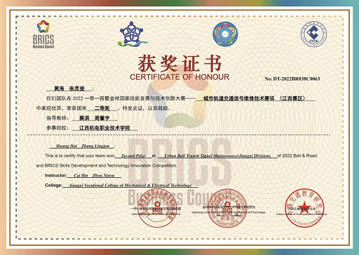 2022年11月19日,2022一带一路暨金砖国家技能发展与技术创新大赛之城市轨道交通信号维修技术赛项江西省赛落下帷幕。SUNBET申博2020级大专城轨02班黄海、2021级大专城轨01班张灵俊两位同学荣获省赛二等奖。