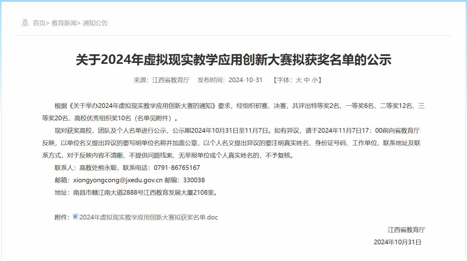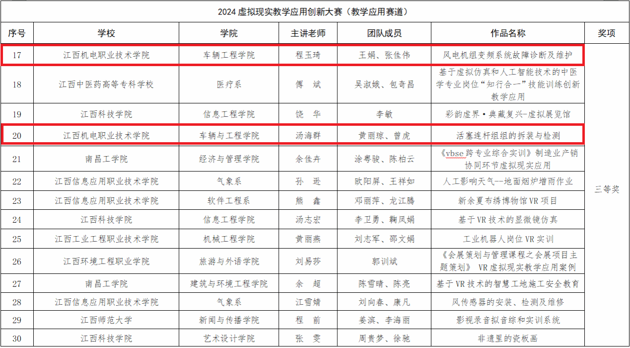 近日,由江西省教育厅、江西省工业和信息化厅、南昌市人民政府共同举办的2024年虚拟现实教学应用创新大赛落下帷幕,公司教师取得较好成绩。其中程玉琦团队、汤海群团队均获教学应用创新赛道三等奖。