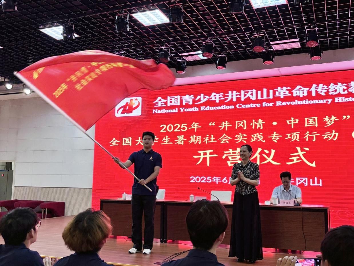 开营仪式上,“红创匠心”实践队成员朱康鸿作为旗手从全国青少年井冈山革命传统教育基地党委副书记刘文兰手中接过2025年实践活动队旗,标志此次活动正式开启。